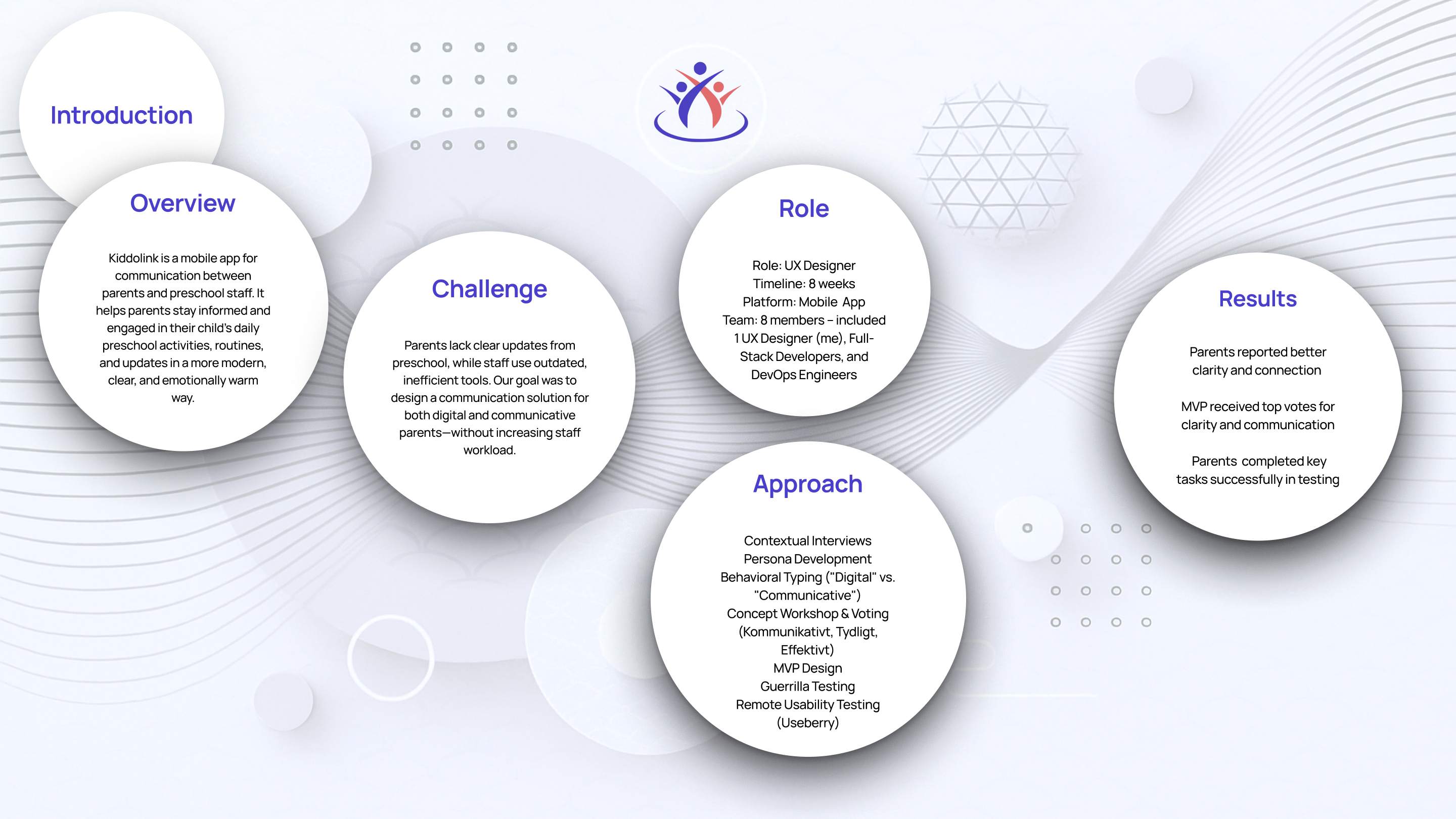 We conducted in-depth interviews with seven parents and two staff to uncover everyday communication challenges in preschool settings. These insights became the foundation for defining user types and shaping the Kiddolink app’s core features.