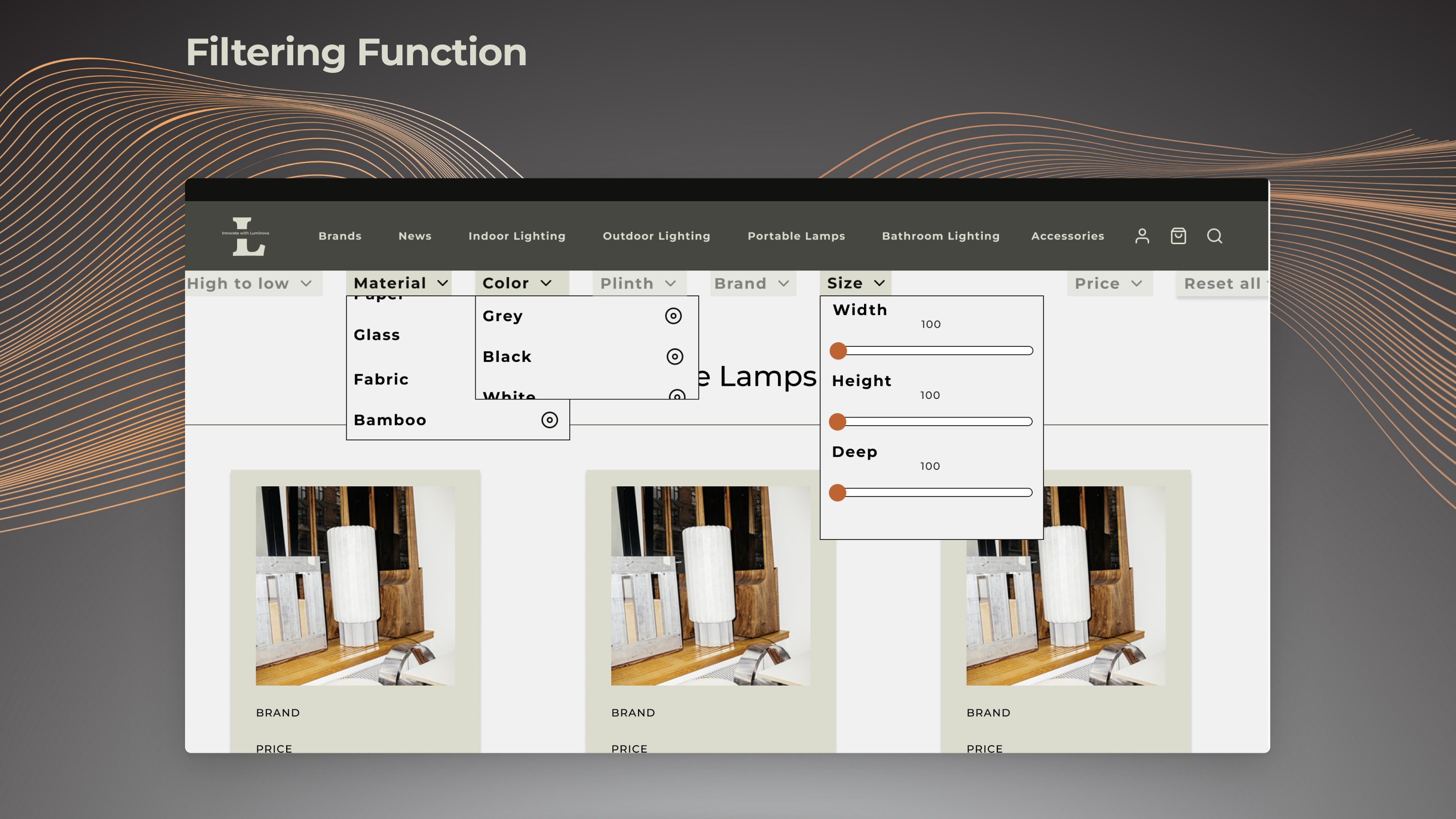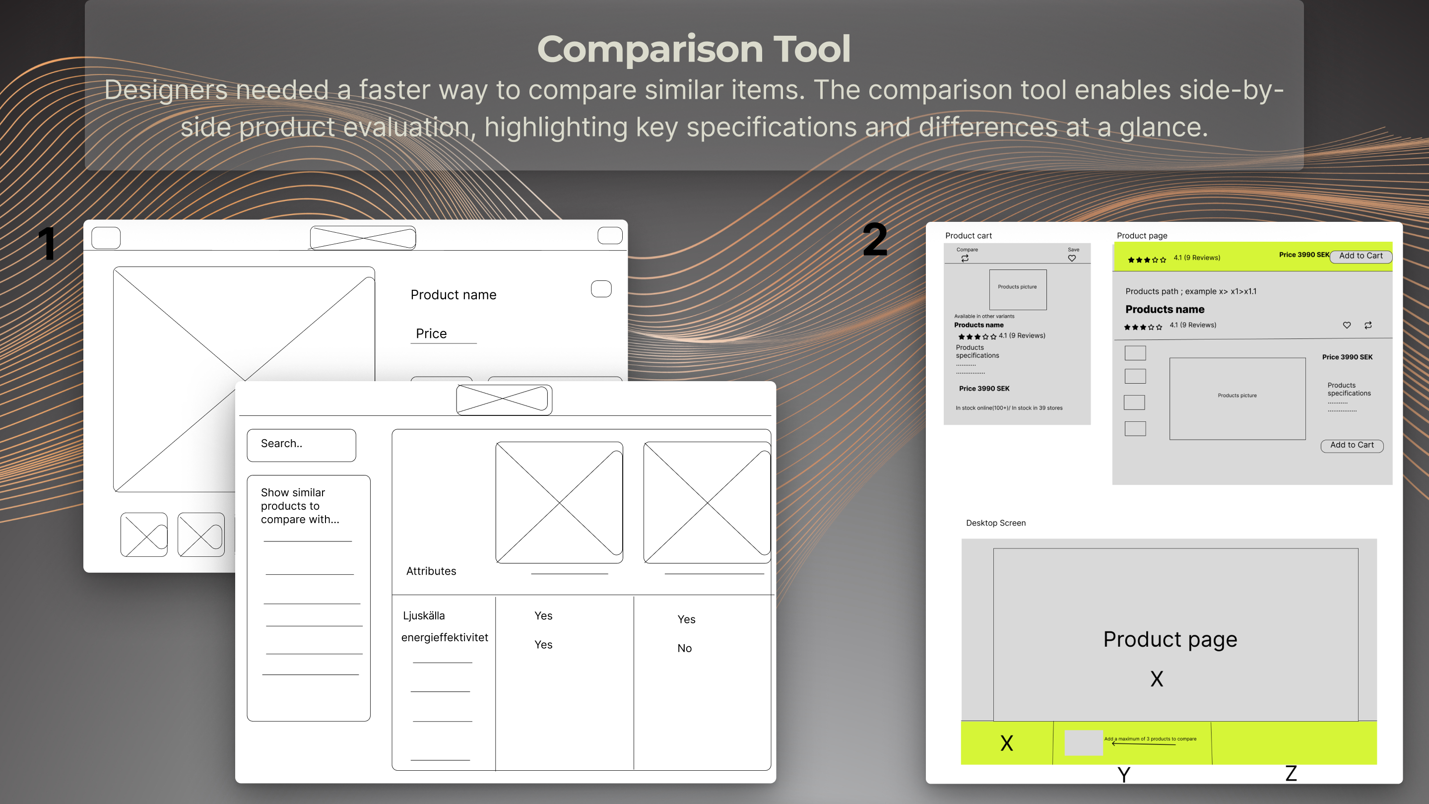 We translated user needs into concrete design solutions. The following wireframes illustrate how we approached filtering, comparison, and visualization features to simplify the shopping experience for modern lighting and chandeliers.
