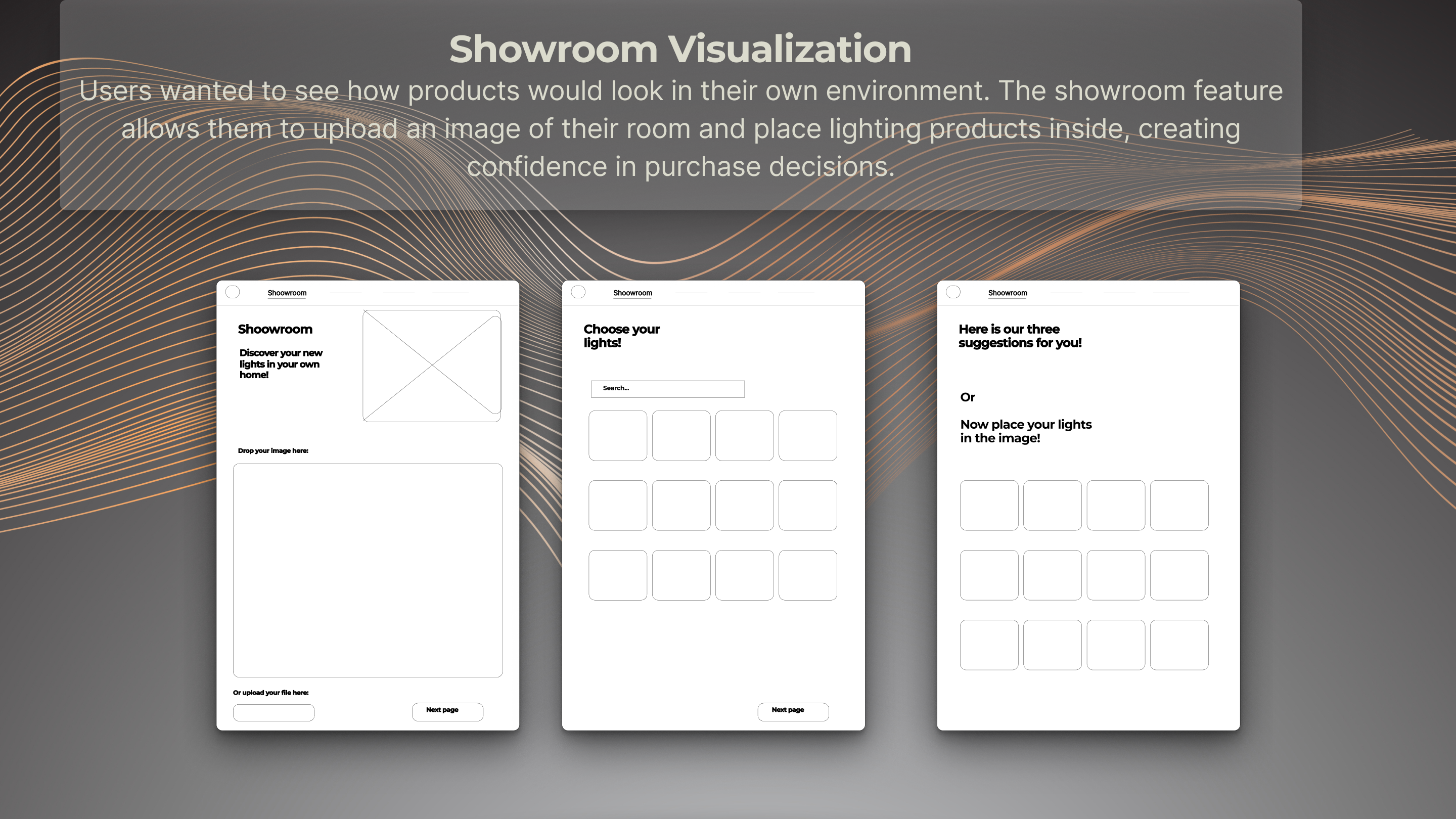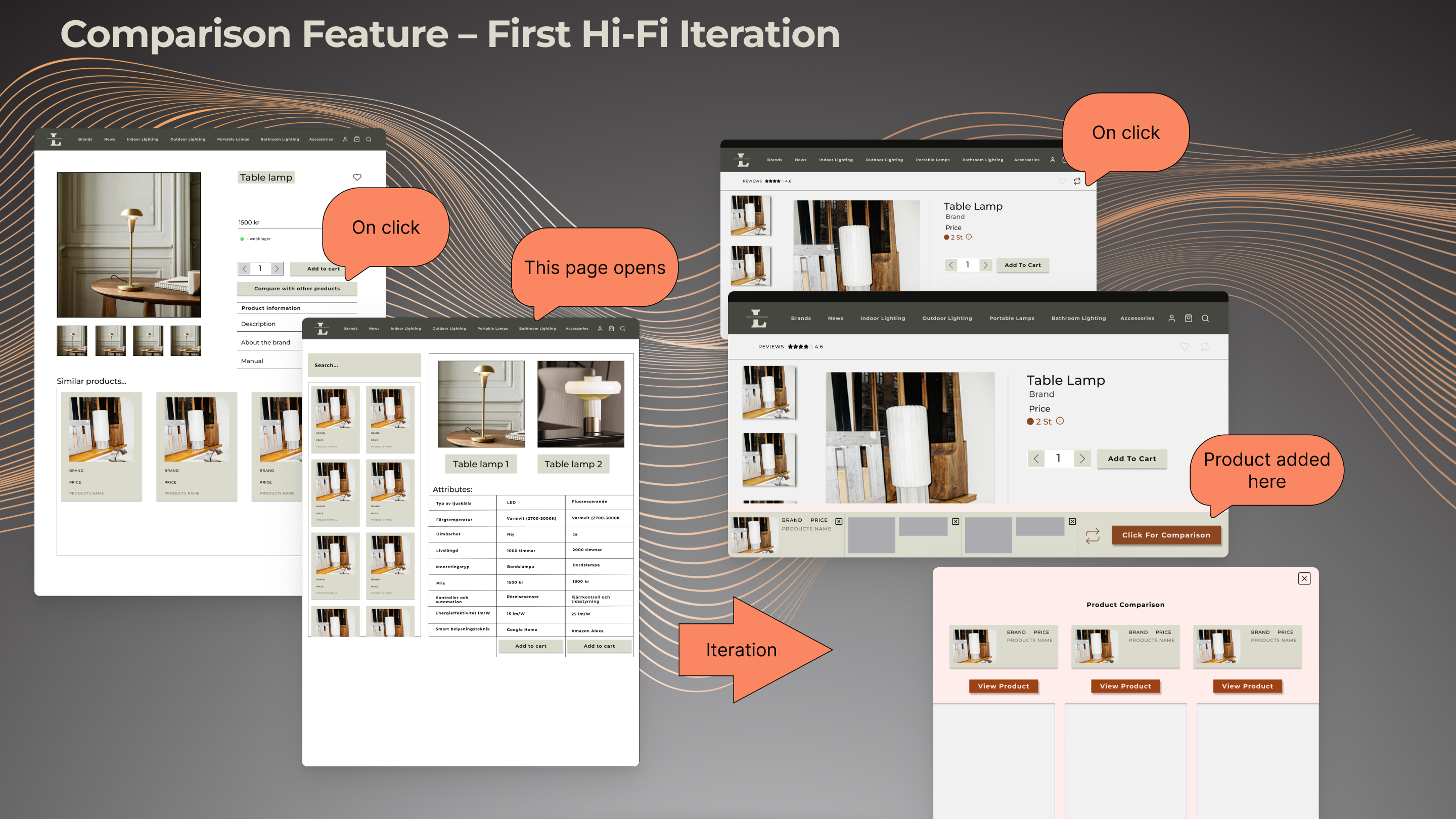 Each wireframe evolved into a validated design — shaped by user needs for filtering, comparison, and visualization. The final interface demonstrates how insights were translated into clear, modern, and functional solutions for lighting e-commerce.